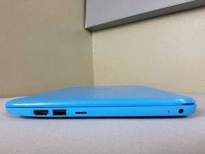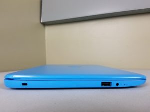 Not only does the HP Stream 11 feel good to hold and use, but it looks good as well. The HP Stream 11 features a vibrant bright blue (also available in purple) chassis. NBR loved the bright vibrant colors. It’s a fun way to differentiate the laptop from its competitors and it makes it a great choice for consumers that want something a little different. The lid also has a nice textured feel with raised horizontal striations. The HP Stream 11 is rounded along its corners and the black circular HP logo contrasts beautifully against the vibrant bright backdrop.